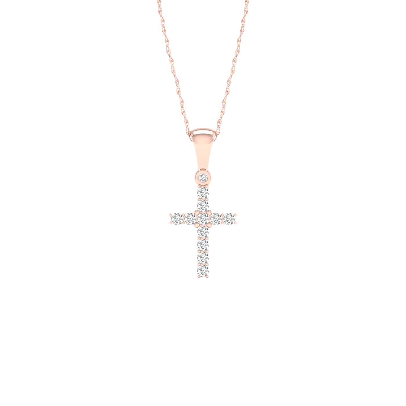 Faith and fashion meet in this dazzling diamond design. Crafted in Rose gold, this traditional cross is completely outlined with a glittering array of shimmering diamond accents while the 18.-inch rope chain necklace secures with a spring-ring clasp.