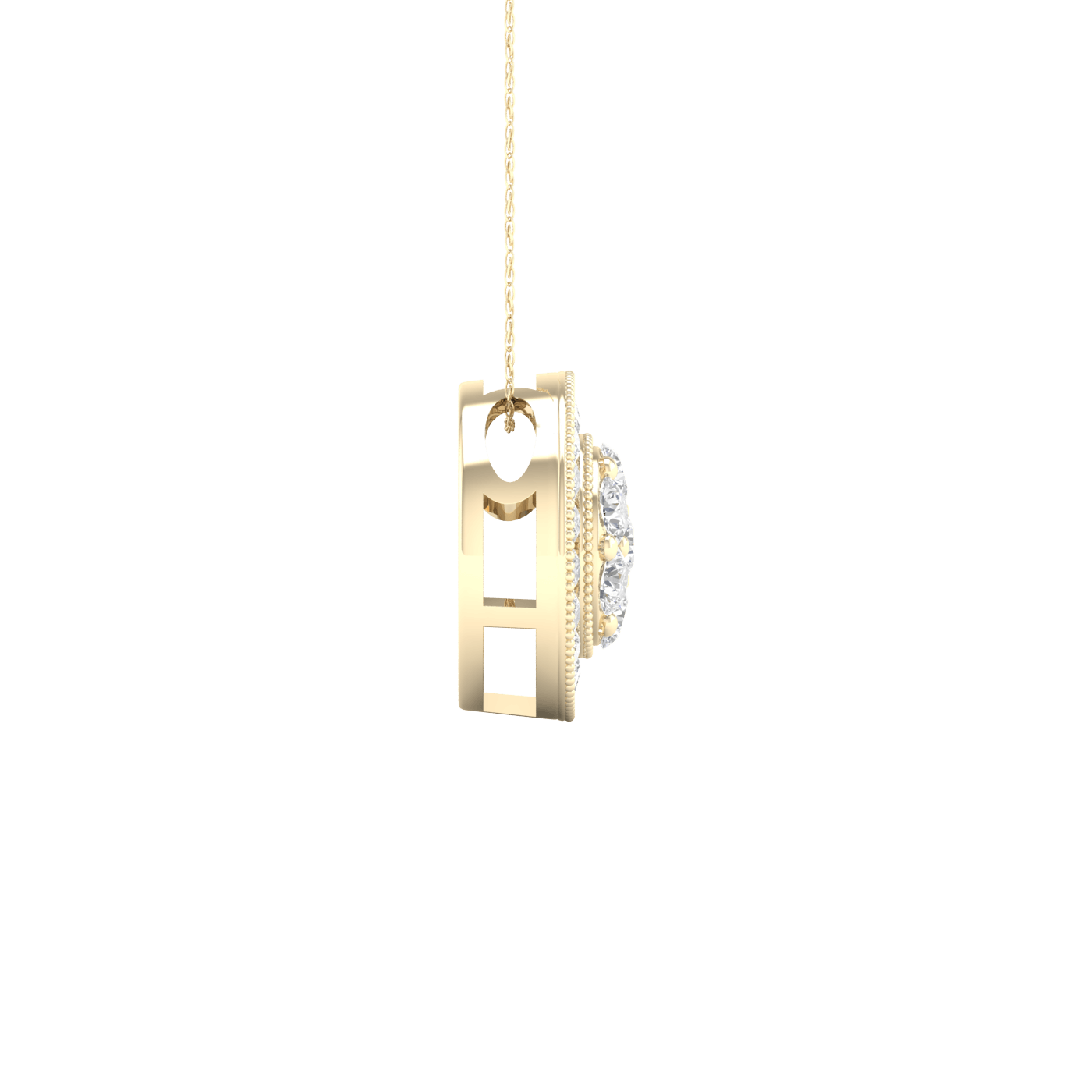 Dazzling diamonds are always an excellent choice and she will absolutely adore this delightful pendant. Fashioned in Yellow gold, this design showcases a round diamond center stone surrounded by a single frame of smaller accent diamonds.