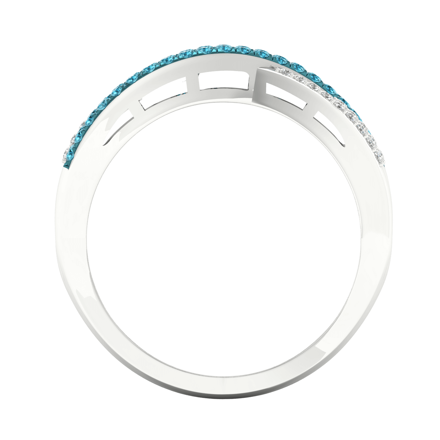 This charming diamond ring showcases delicate bands of 1-karat white gold crossing over each other in a dazzling design. The band is set with rows of white and blue diamonds, creating a piece you will treasure forever.