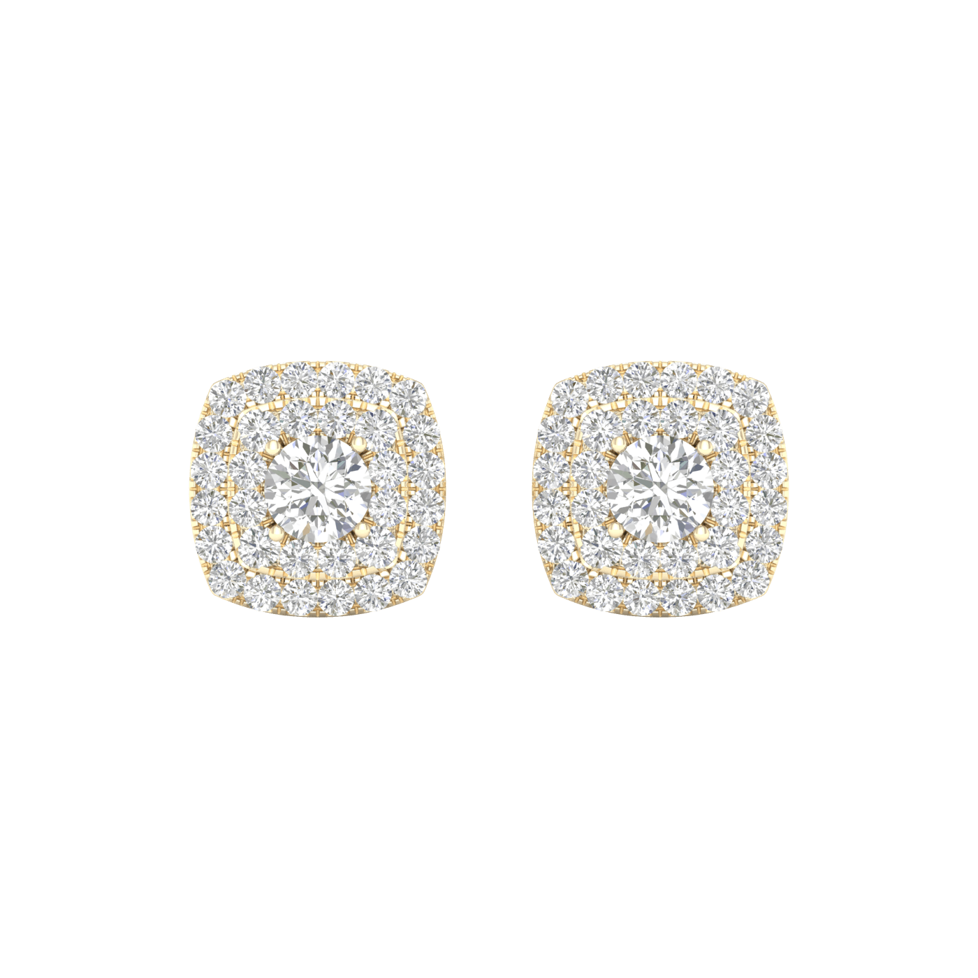 Each earring showcases a round diamond center stone. A double squared frame of shimmering round accent diamonds surrounds each center stone, completing the traditional design. These post earrings secure comfortably with friction backs.